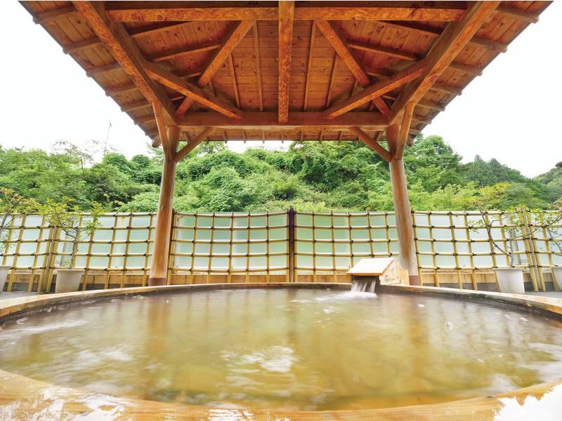 キズに効能が高い美肌の湯「鎌先温泉」を古代檜の露天風呂、豪華絢爛な黄金風呂、御影石で造られた石風呂の3つのお風呂で楽しむ。滞在中はいつでも入浴可能なのも嬉しい。