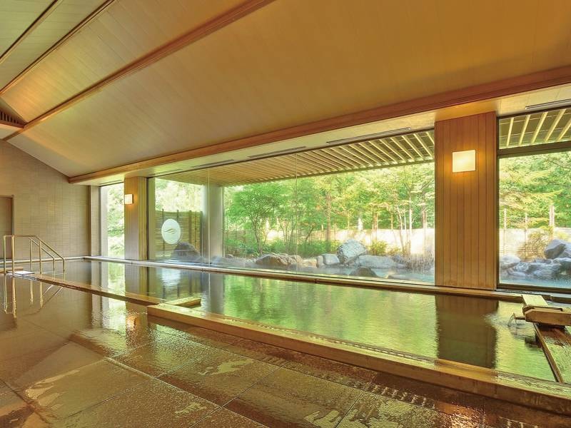 開湯800年、歴史ある名湯を愉しむ。雑木の山が水面を色鮮やかに四季を美しく彩る露天風呂。開放感ある広い大浴場からは四季折々の景観も楽しめる