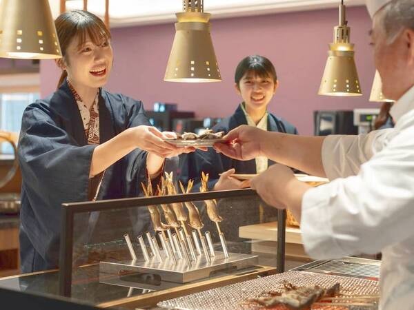 【夕食】ライブキッチン 旬の川魚の塩焼き 焼き立ては身がふっくら。
