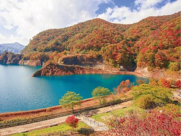 【周辺 奥四万湖】展望台まで当館から車で約5分 秋には赤く染まった木々と水面との対比が人気