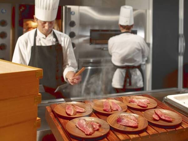 【夕食/例】 牛ロース鉄板焼きはライブキッチンでご用意しております
