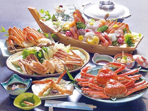 豪華舟盛付きカニフルコース/写真一例 冬の味覚の王様ズワイガニをお一人に3杯使ったカニフルコースと地魚の豪華舟盛でボリューム満点!