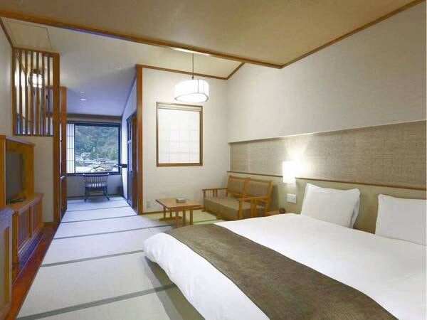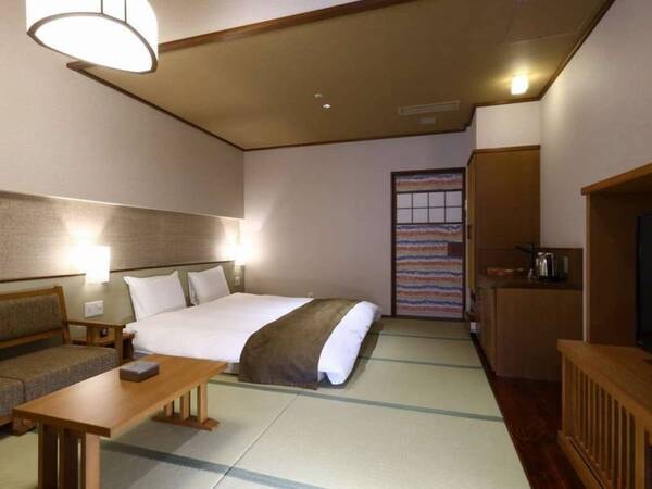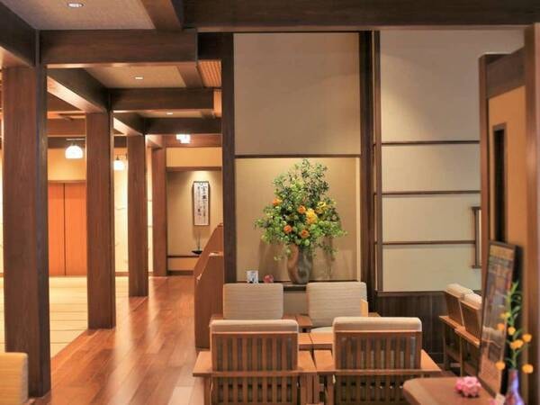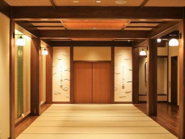 【迎えの間】出雲神話にまつわる装飾、畳と木から感じる暖かさと懐かしさ。至福の時をお愉しみ下さい。