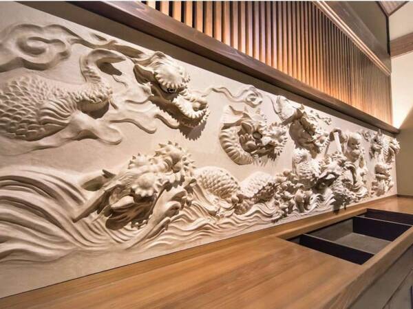 【帳場】いにしえの香り漂うロビー。帳場にある出雲神話のモチーフは圧倒されるスケール。