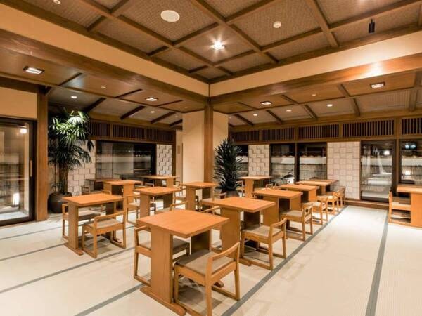 【食事処:天雅】全席イスとテーブル。お庭の見える席もございます。