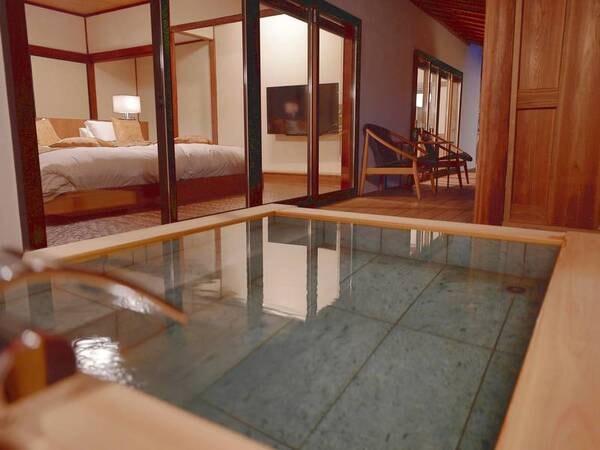 【源泉かけ流し露天風呂付スイート『九段』/例】広い源泉かけ流し露天風呂付テラスと洋室(ツインベッド)+4.5畳+6畳和室