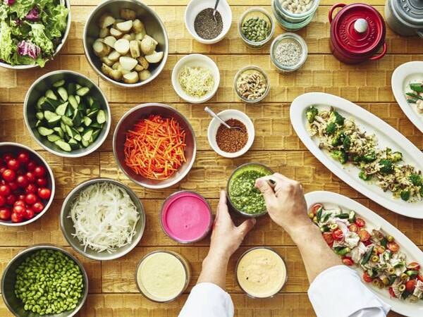 【15品目の新鮮野菜のサラダビュッフェ】地元野菜も多く使った新鮮なサラダビュッフェ。シェフ自慢の自家製ドレッシングとともにお楽しみください。