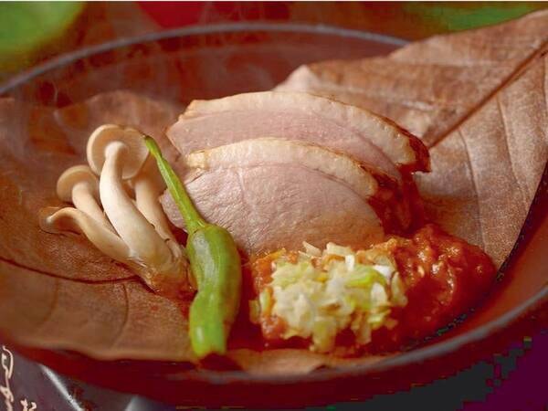 鴨と葱の朴葉味噌焼き/例