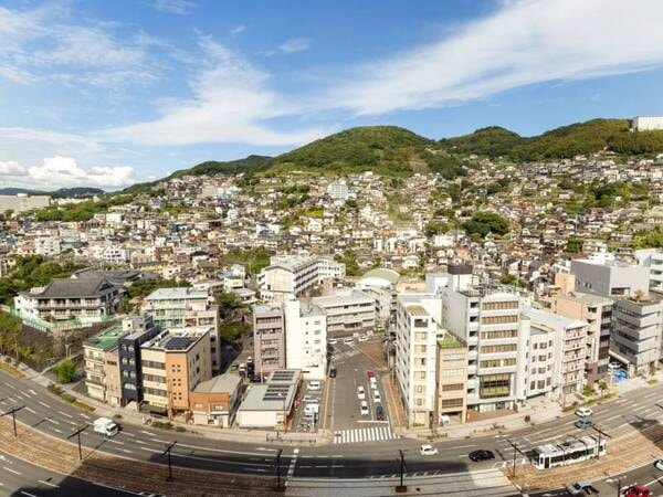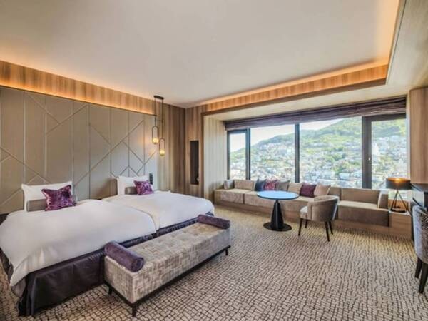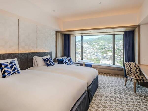 【デラックスシティビューツインルーム/例】快適さと贅沢さを追求した広々とした客室です。窓からは、路面電車が走る長崎のならではの街並みを楽しむことができます。