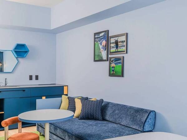 【スタンダードスタジアムビューEXCツイン/例】長崎スタジアムシティのスタジアムをコンセプトにした客室は、サッカーをテーマにしたアートやデザインが随所に施されています。