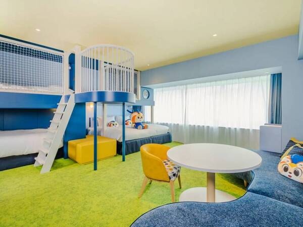 【スタンダードスタジアムビューツインルーム/例】木目調で落ち着いた内装の客室と、家族楽しく過ごせるポップな内装の客室の2種類ございます。
