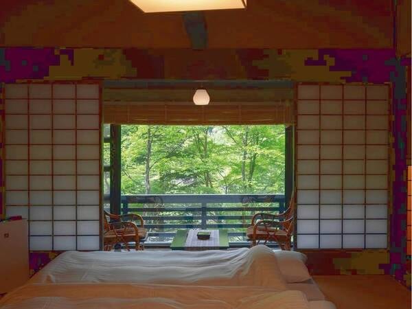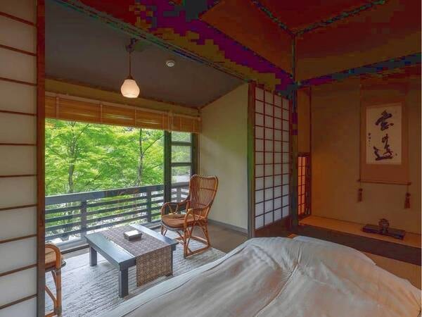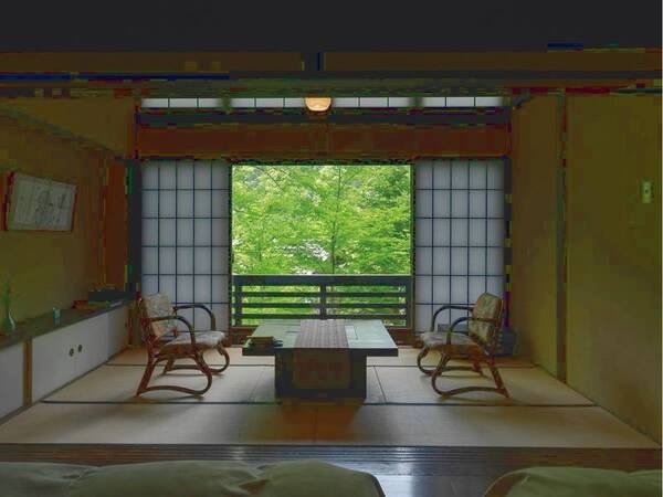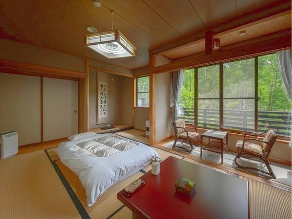 【特別室<胡蝶>/例】和室10畳+4畳。階角部屋に位置する、白樺林と霞沢岳が望めるお部屋です。