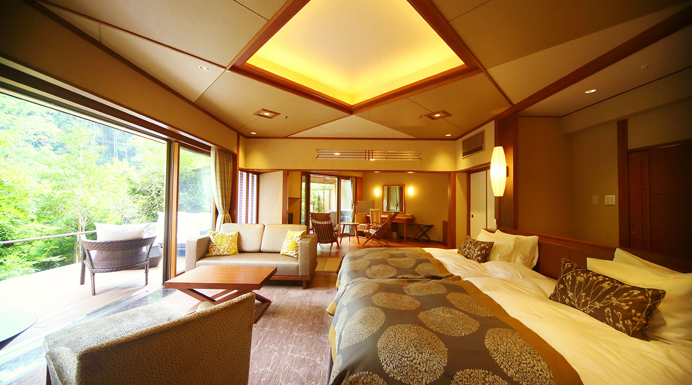 露天風呂付客室などが勢ぞろい - 客室は31~194平米まで多彩なタイプがそろいます。最近では生活様式の変化から「和室よりベッドがいい」という声も多く、靴を脱ぎ畳でくつろぎつつも、夜はシモンズベッドでゆったり…そんな旅館とホテルの両方の良さを取り入れた客室もそろいます。また露天風呂付客室は、お子さま連れの方や介護が必要な方も安心してくつろげると人気です。