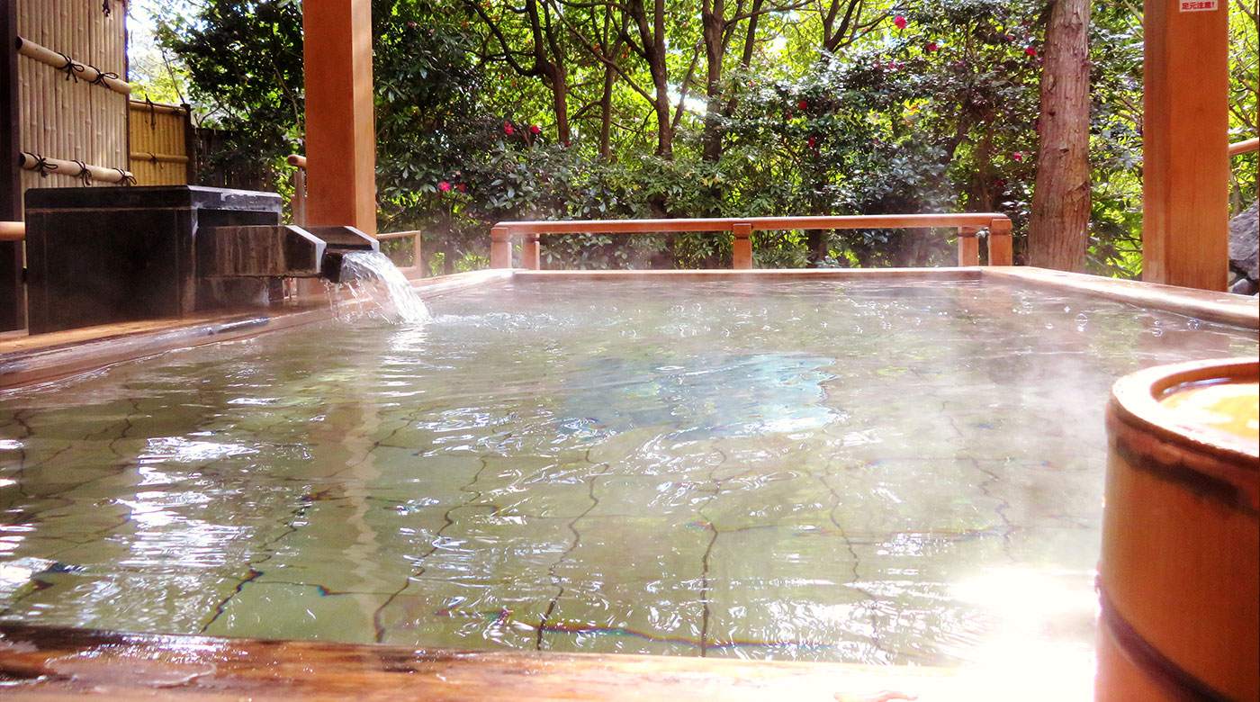 輝く木々の緑が爽やかな温泉 - 内湯や寝湯、岩露天風呂や檜露天風呂など11通りもの湯めぐりが楽しめる同館。温泉は150名ほどが入浴できる大空間なので、宿泊者が多い日も混み合うということはほぼありません。pH9.67のアルカリ性単純温泉は、とろみのある美肌の湯として人気。またエステやアロマトリートメントもかなうので、お好みのケアをお楽しみいただけます。