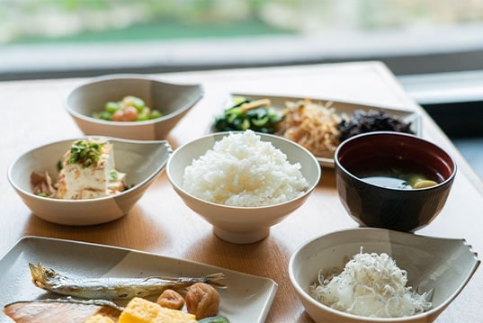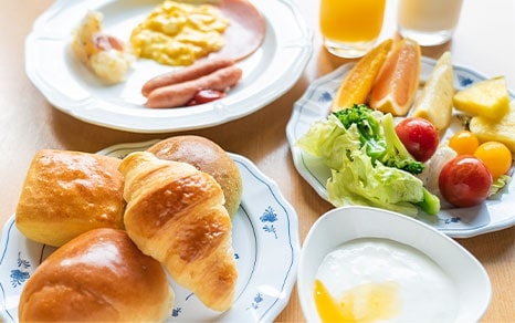 朝食は和洋食のビュッフェを用意。旬の野菜や山菜などをたっぷり使った料理は、朝にぴったりの優しい味わいです。ほかにも種類豊富な焼きたてパンが大人気!こうばしいパンの香りに誘われて、いつもよりたくさん食べてしまうかもしれません。