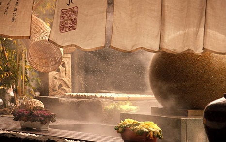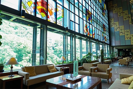 エントランスには大きな石造りのモニュメントが置かれた「お休み処 宝歴」が。ここにも鬼怒川温泉発祥の湯「宝の湯」が流れ、もうもうと湯気を上げています。毎分約300Lも湧出する鬼怒川温泉のルーツに、訪れた瞬間から魅了されてしまう場所です。