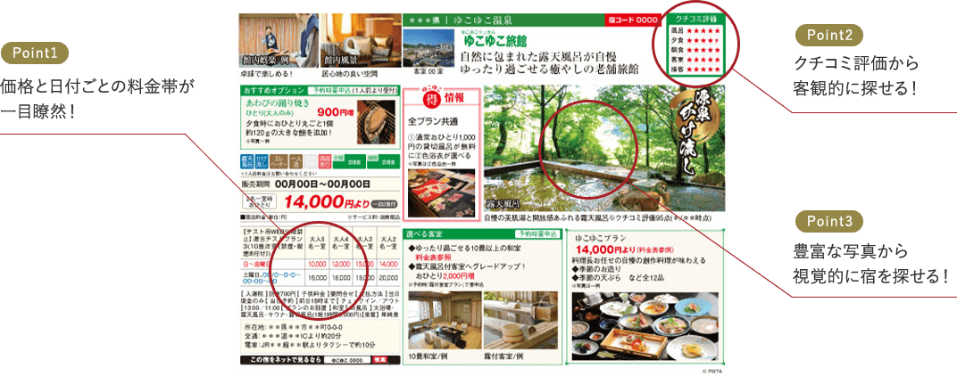 行きたいエリアから、料金やお食事、クチコミによって簡単に比較ができるのは、