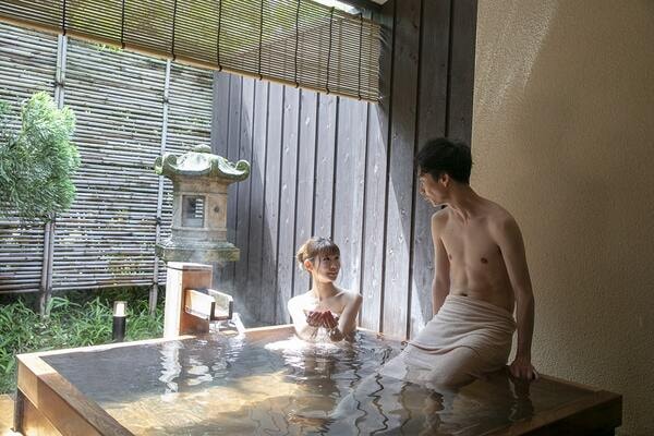 熱海駅から仲見世通りを通って徒歩約2分と、アクセス抜群!広々とした大浴場・露天風呂は2本の自家源泉を贅沢にかけ流し。熱海駅近で良質な湯を堪能できると人気。塩分が濃厚で湯冷めのしない温まる湯。モダンな貸切風呂「貫一の湯」「お宮の湯」も日帰り利用が可能。こちらも嬉しい源泉かけ流し。どちらの貸切風呂もソファのある湯上り処がそれぞれに付いており、入浴後もゆったりできる。館内にいながらにして懐かしい温泉街を歩いているような気分になれる「昔懐かし和モダン湯宿」。