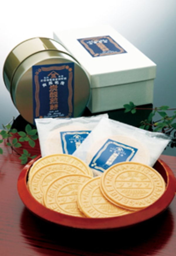 体にやさしい自然食品のルーツの「炭酸煎餅」。煎餅にはバターや卵、添加物など一は切使われていない。明治時代より親しまれている代表名物。職人がせんべいを1枚1枚丁寧に焼き上げ、店内では炭酸煎餅を手焼きしている様子が見れる。