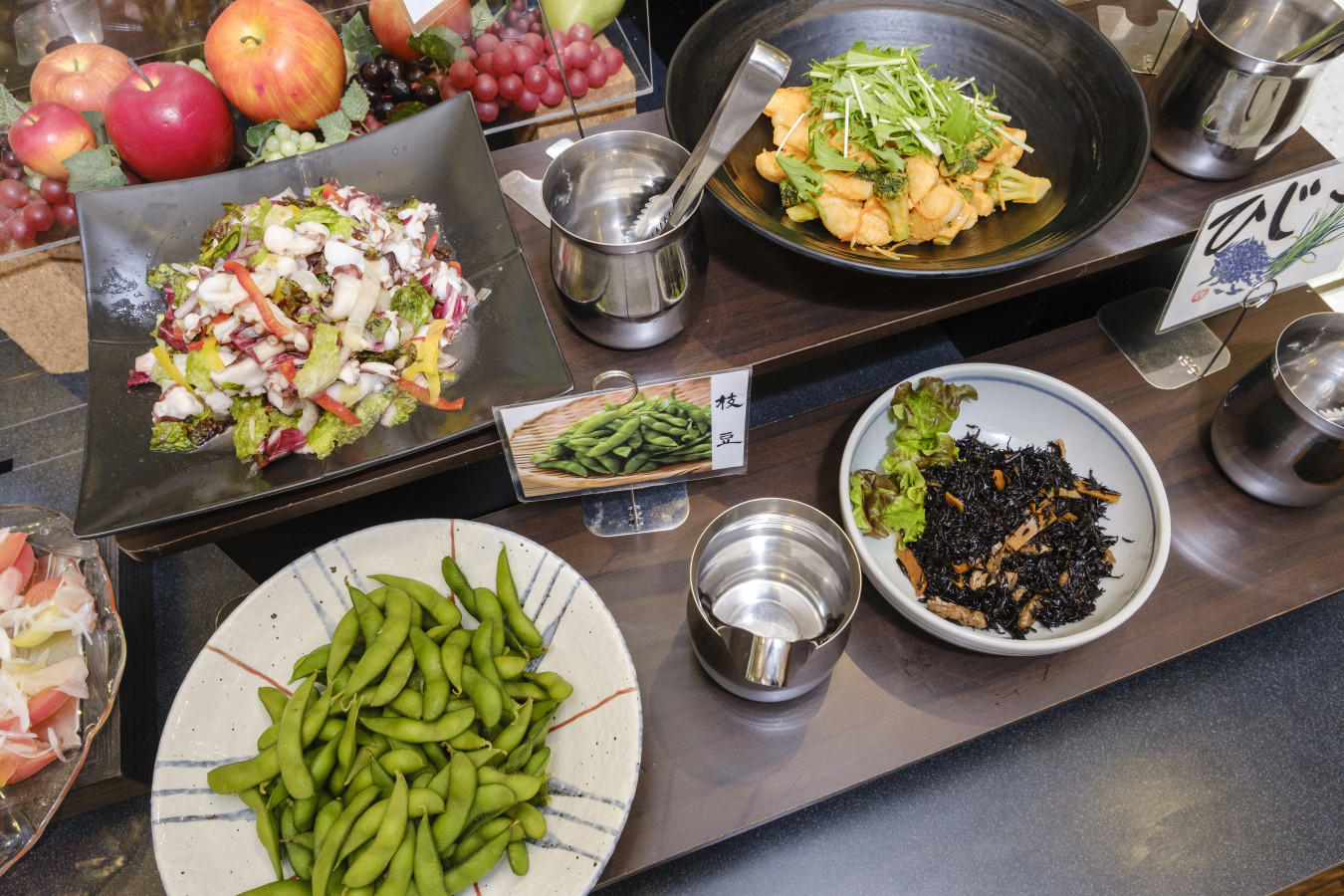 食事は信州の豊かな自然を一望するレストランにて。夕食・朝食ともに和・洋・中の品数豊富なビュッフェで、どれにしようか迷ってしまうほどでした。「現代湯治」で連泊する人への配慮から、40種類以上のメニューは日替わりで多種多様。