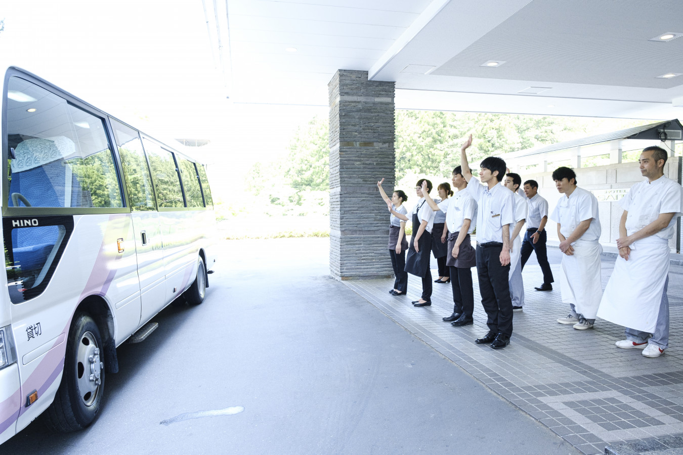 上田駅から出ている無料の送迎バスに乗り込むと、豊かな森に抱かれて建つ、12階建ての近代的なホテルに到着しました。
